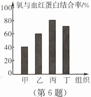 6. 如图所示,长方形的高度表示甲、乙、丙、丁四种组织处,血红蛋白与氧的结合情况。试推测甲、乙、丙、丁四种组织中,呼吸作用最旺盛的是 ( )