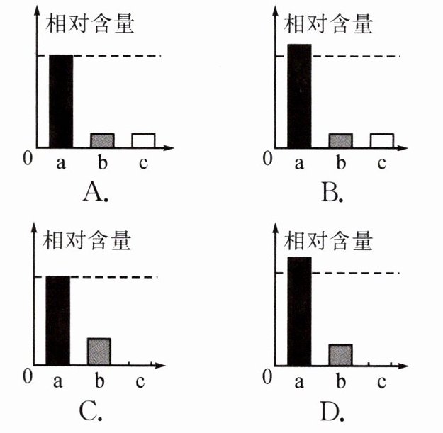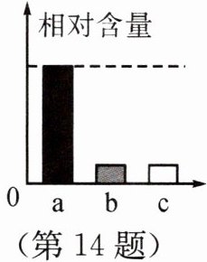 14.一个健康成年人血浆中的水(a)、无机盐(b)和葡萄糖(c)的相对含量如图所示。该人大量饮水后,尿液中各成分相对含量最接近于 ( )