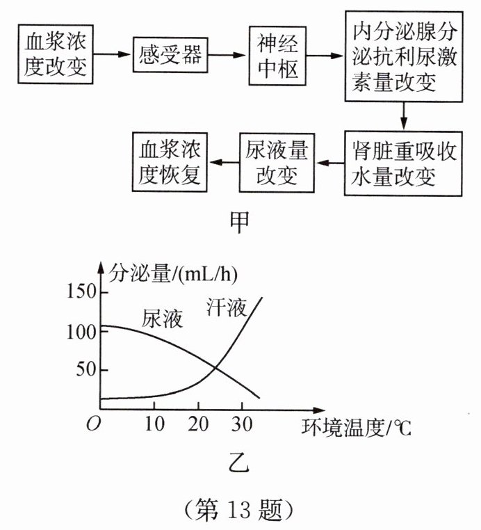 13.【温州】人体内水的平衡对健康有着重要意义。图甲是人体水平衡调节过程的部分示意图。