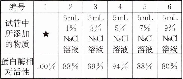 7. 【宁波】新鲜菠萝果肉中的菠萝蛋白酶能分解口腔黏膜和舌头表面的蛋白质,引起口腔麻木刺痛感。若菠萝用盐水浸泡后再食用,不适感会减轻。小科猜测可能是盐水影响了菠萝蛋白酶的活性。为研究盐水对菠萝蛋白酶活性的影响,小科取6支相同的试管,编号1~6,各加入5mL鲜榨的含菠萝蛋白酶的菠萝汁,再按下表分别添加物质,置于37℃的温水中保温。20min后测定蛋白酶的活性,并计算其相对活性,数据如下表所示: