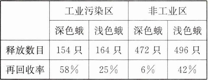 11. 科学家做过如下实验:将深色桦尺蛾和浅色桦尺蛾分别进行标记,然后放养于不同的地点,一段时间后,将所释放的桦尺蛾尽量收回。统计其数目,结果如下表: