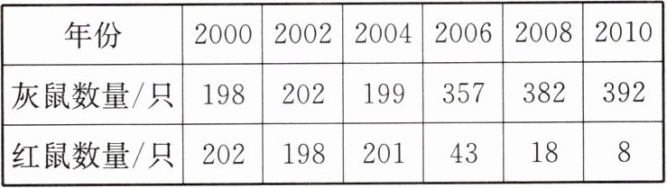 10. 【嘉兴】有一个火山岛上分布着数目相近、毛色不同的同种鼠,后来由于火山爆发,火山灰覆盖了整个小岛。某生态学家自2000年起每隔两年对鼠的数量进行调查,结果如下表所示。