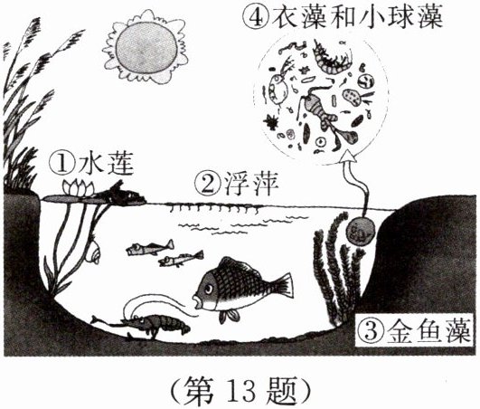 13. 池塘中的水生植物群落也具有分层现象。如图所示为池塘中的四种主要水生植物。请你回答下列问题(填序号):