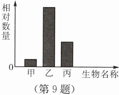 9. 【衡阳】如图所示为一个生态系统中某些生物的相对数量关系,甲、乙、丙三者中能量最多的是乙,这些生物构成的一条食物链是 ( )