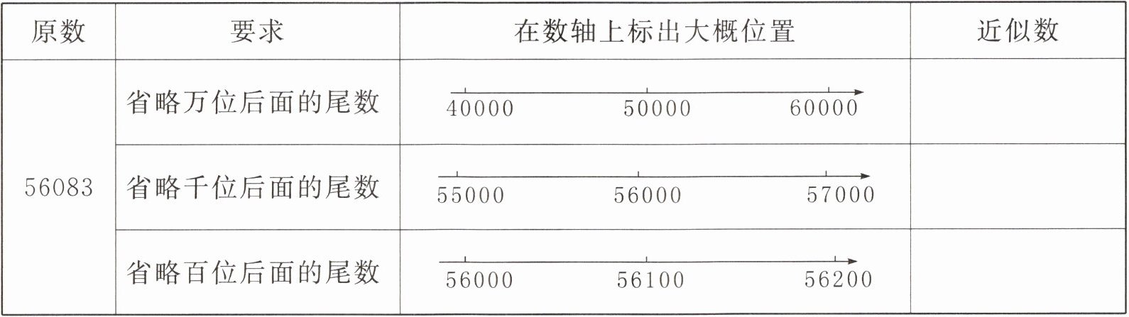 $56083$百位是$0\lt5$,舍去百位及后面的数,近似数是$56000$。