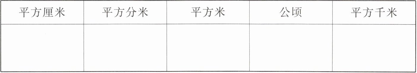 平方厘米$\longleftrightarrow \frac{(\quad)}{(\quad)}$$\longleftrightarrow \frac{(\quad)}{(\quad)}$$\longleftrightarrow \frac{(\quad)}{(\quad)}公顷\longleftrightarrow \frac{(\quad)}{(\quad)}$$\longleftrightarrow \frac{(\quad)}{(\quad)}$