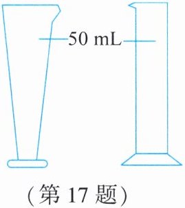 17. 如图所示,一个量筒和一个量杯的量程都是$50mL$(设底部到量程的高度都是$h$),如果倒入$25mL$的液体,对量筒而言,所装液体的液面将______(填“$>$”“$<$”或“$=$”,下同)$\frac{h}{2}$,对量杯而言,液面的高度将______$\frac{h}{2}$。如果它们的分度值都是$1mL$,那么当所测液体体积较小时,选用______(填“量筒”或“量杯”)测量要更准确。