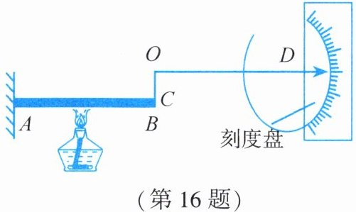 (2) 他重新设计了如图所示的装置研究物体长度随温度变化的情况。装置中$AB$是粗细均匀的铜棒,$COD是可绕O$点转动的指针。实验时,$A$端固定不动,指针$C端紧靠在铜棒B$端,当用酒精灯给$AB$加热时,小明可以通过观察______分析金属棒受热时长度的变化。装置中指针设计成$CO段比OD$段短,这对实验现象起到了______作用。