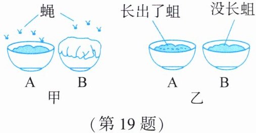 19. 你只要留心观察,就会在生活中发现许多有趣的问题。例如,当你观察到腐烂的肉上有一些蛆的时候,也许会提出“蛆是从哪儿来的”这一问题。对此,我们可能会设想:蛆是由蝇产生的。下面的实验和观察有助于我们作出科学的判断。
