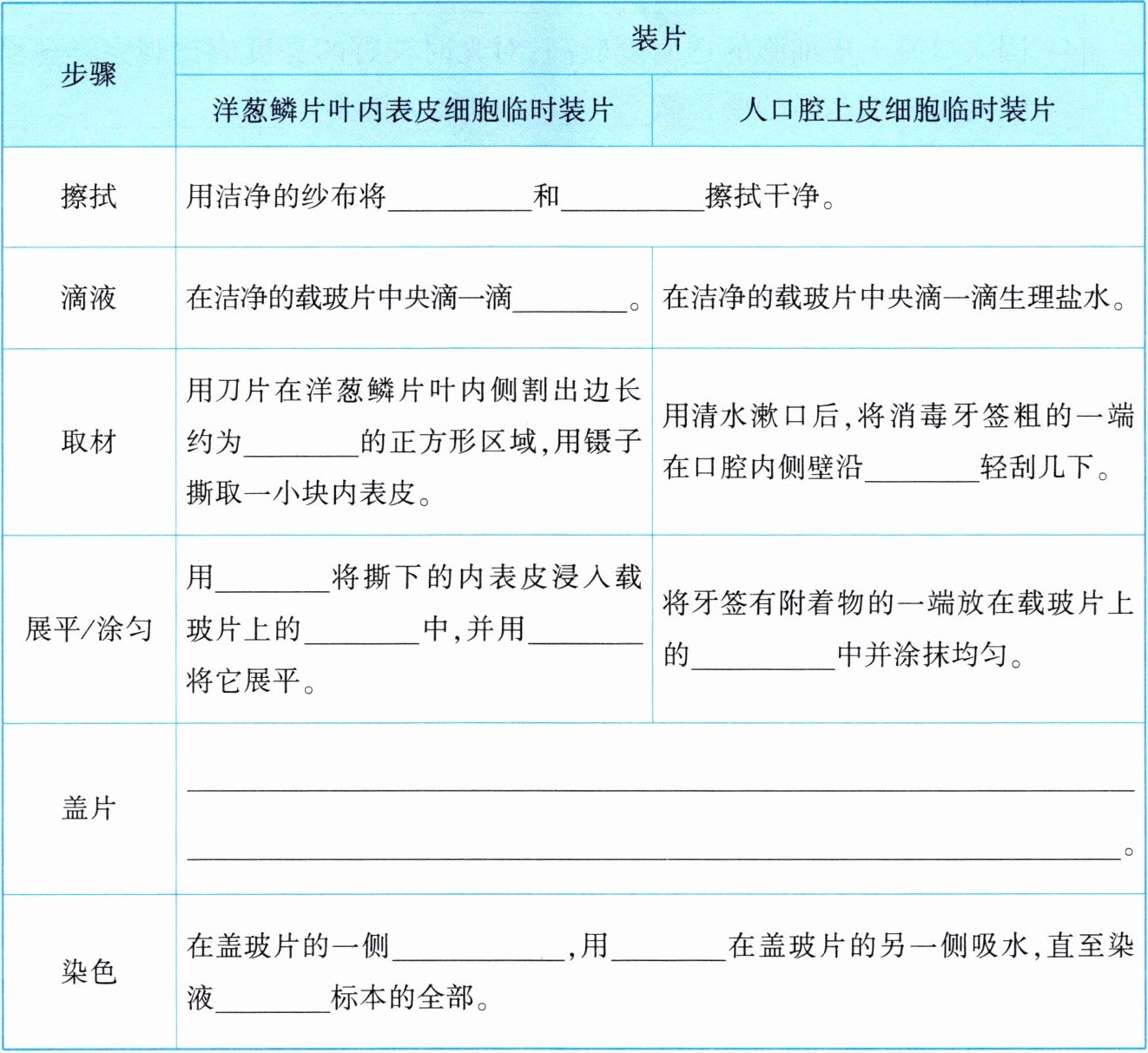3. 下表是制作洋葱鳞片叶内表皮细胞和人口腔上皮细胞临时装片的步骤,请将表中步骤补充完整。