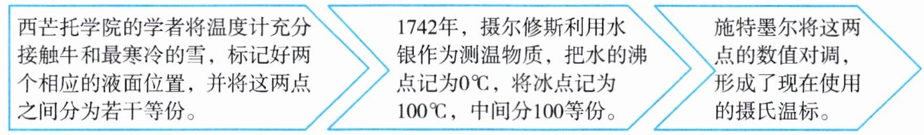 |西芒托学院的学者将温度计充分接触牛和最寒冷的雪,标记好两个相应的液面位置,并将这两点之间分为若干等份。|1742年,摄尔修斯利用水银作为测温物质,把水的沸点记为0℃,将冰点记为100℃,中间分100等份。|施特默尔将这两点的数值对调,形成了现在使用的摄氏温标。|