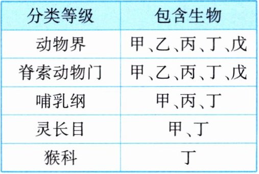 5. 甲—戊5种动物的部分分类等级关系如表,下列有关说法错误的是( )。