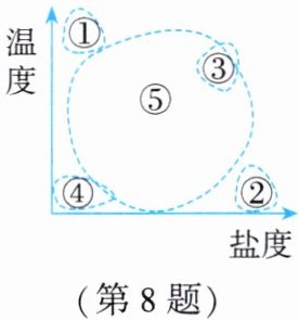 8. 如图绘出了①—⑤五种鱼的耐盐范围和耐温范围。在这五种鱼中,____适合生活在以北极为中心的北冰洋;适合生活在热带淡水湖泊和河流中的是____,分布最广泛的是____。(填序号)