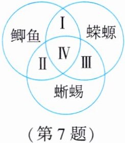 7. 某同学将鲫鱼、蝾螈、蜥蜴三者之间的特征关系用如图表示,下列有关说法正确的是( )。