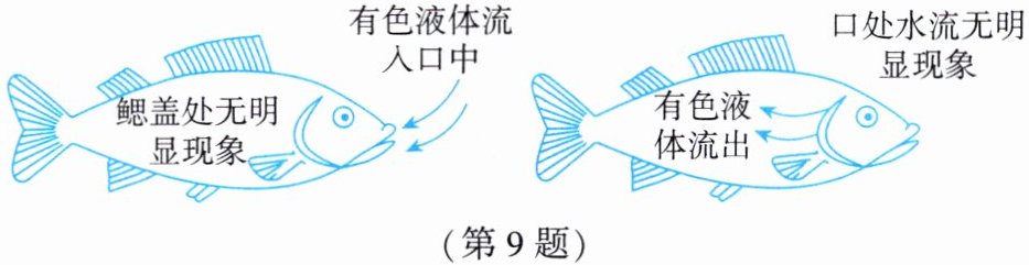 9. 为探究鱼的呼吸过程中,口和鳃盖的张合情况和水流方向的关系,某同学用滴管在鱼口前滴加有色液滴后,观察现象。