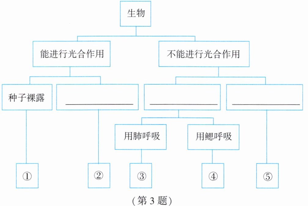 3. 生物种类繁多、形态多样,因此对生物进行分类非常重要。如图为苏铁、睡莲、麻雀、鲫鱼、蚱蜢5种生物的二歧分类检索表。