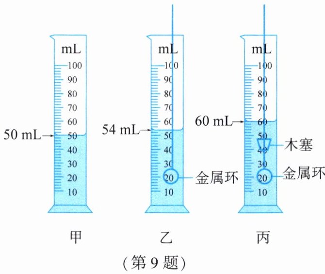 9. 为测量一个木塞的体积,某同学按右图中甲、乙、丙的步骤进行了实验。其中金属环的作用是______,木塞的体积为______$cm^{3}$。