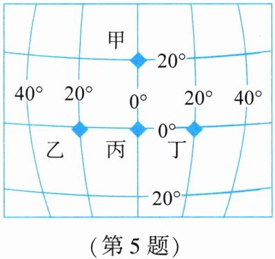 5. 一位游客在旅行日记中写道:我到达过世界上一个神奇的地方,在那里,我面向北半球,背对南半球,右手位于东半球,左手位于西半球。这个神奇的地方就是图中的( )。