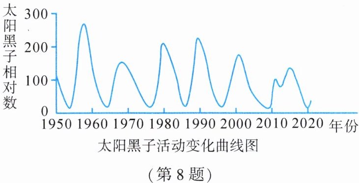 (1) 据图可知,太阳黑子活动的两个峰年之间的时间约为____年,图中最近一次太阳黑子最大活动期在____年,据图推测,下一次太阳黑子最小活动期在____年。