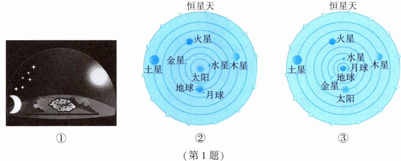 1. 以下是人们在认识宇宙的过程中,几种具有代表性的观点。请据图回答以下问题: