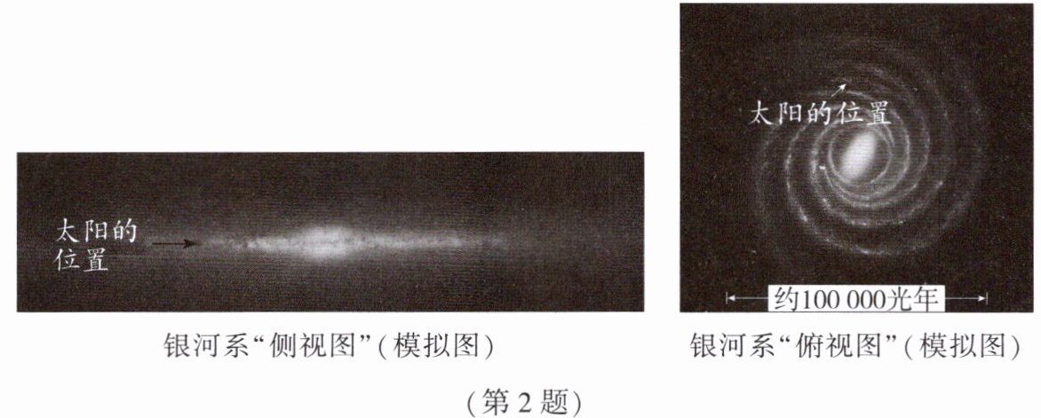 2. 银河系是众多____及____组成的一个巨大星系。银河系的直径约为____光年,中心厚度约为$1.2×10^{4}$光年,自中心向边缘逐渐变____。从侧面看,银河系呈____状;从上往下看,能看到银河系的旋涡结构。我们无法从地球上看到银河系的旋涡结构,是因为____。