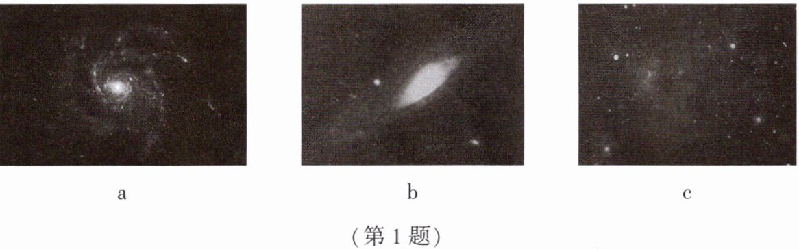 1. ____是由单颗恒星、恒星系统、星团、尘埃和气体在引力作用下聚集在一起形成的大型天体系统。天文学家把星系分为三类,下图中,图a为____星系,图b为____星系,图c为____星系。银河系属于____星系。