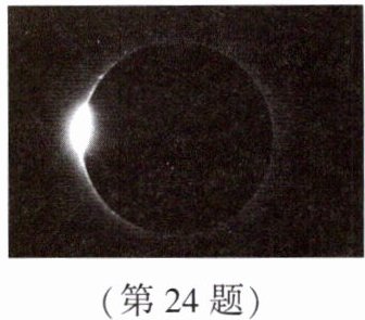 24. “贝利珠”是一种天文现象。日全食期间,虽然月球将太阳完全遮掩住,但由于月球表面凹凸不平,日光仍可透过凹处发射出来,形成类似珍珠的明亮光点。如图为发生日全食时所拍摄的太阳的“贝利珠”照片,图中太阳大气层中的____被月球遮挡;图中被遮挡部分发生的太阳活动有____。