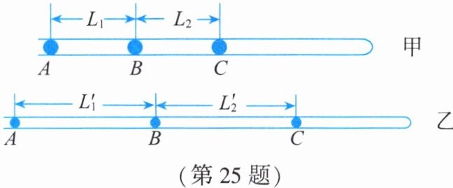 步骤二:固定住橡皮筋的A端,拉住另一端使橡皮筋伸长(弹性限度内均匀伸长),如图乙所示,量出此时AB和BC间的距离为$L'_{1}= L'_{2}= b$。