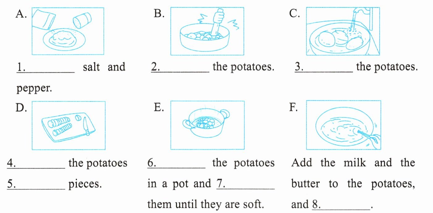 Ⅱ. 1. Add 2. Mash 3. Wash 4. Cut 5. into 6. Put 7. boil 8. mix