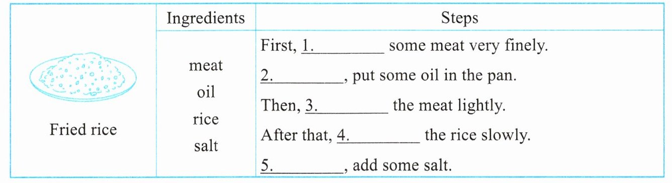 1. cut 2. Next 3. fry 4. add 5. Finally