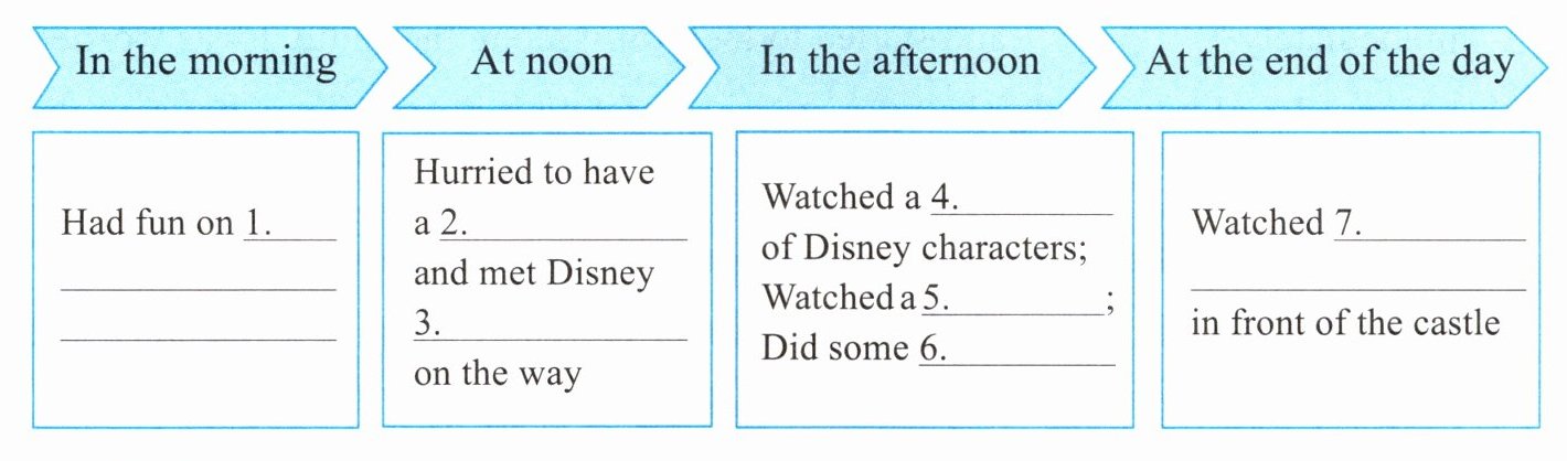 A. 1. TRON Lightcycle Power Run 2. quick meal 3. cartoon characters 4. parade 5. 4-D film 6. shopping 7. the fireworks show