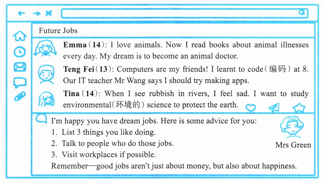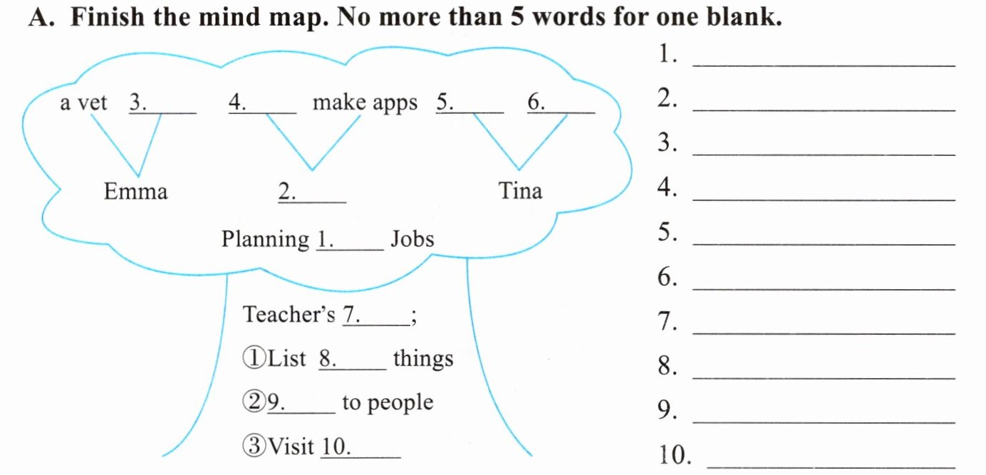 A.1. ftre/dream 2. Teng Fei 3. read books about animal illnesses 4. an IT engineer 5. a scientist 6. study environmental science 7. advice 8.3 9. Talk 10. workplaces