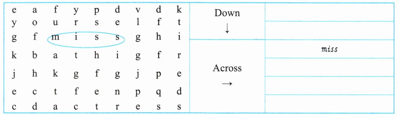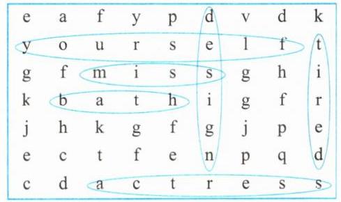 1. yourself / yourselves 2. design 3. tired 4. misses 5. actress 6. bath