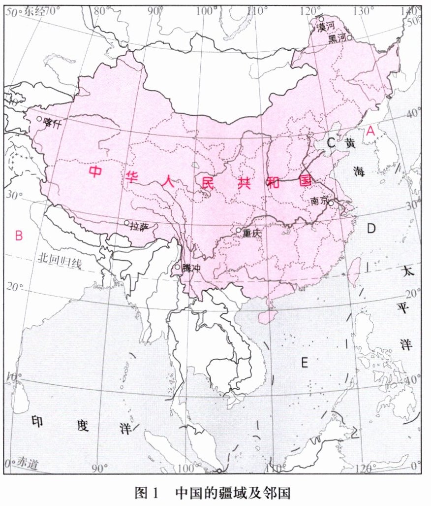 (1)我国是个海陆兼备的国家,陆上邻国 A 是______,B 是______,濒临的海洋 C 是______,D 是______,E 是______。
