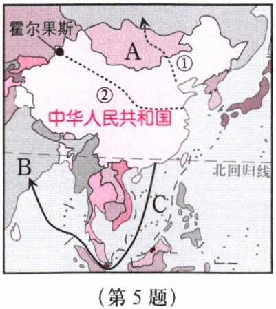 (2)从图中可知,我国出口物资通过海洋运输所经的海域 C 是______,而邻国 B______是我国重要的贸易伙伴之一。