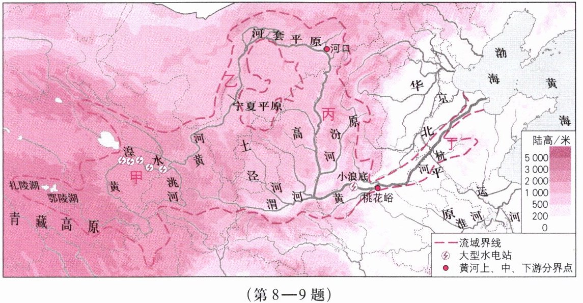 完善黄河流域生态保护大协同格局,守护黄河安澜。读“黄河流域”图,回答第 8—9 题。