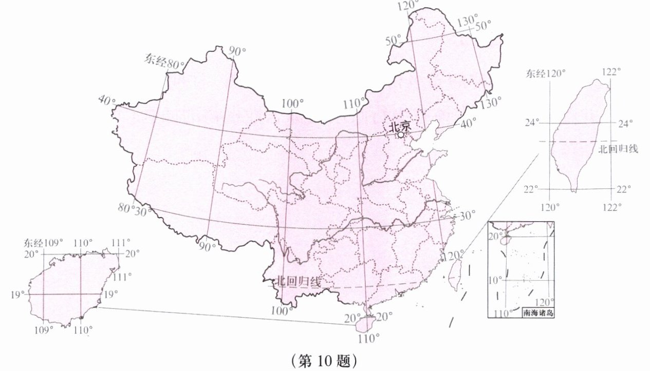 10. 我国主张管辖海域面积约 300 万平方千米,近海分布着 1.1 万余个岛屿,台湾岛和海南岛是面积位于前两位的岛屿。阅读图文材料,回答下列各题。
