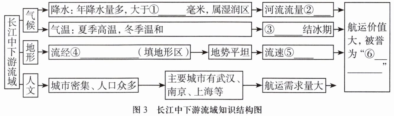 (3)①800 ②大 ③无 ④长江中下游平原 ⑤缓慢 ⑥黄金水道
