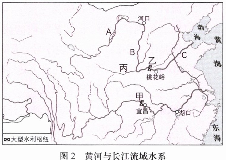 (2)图 2 所示甲、乙两个水利枢纽工程中,表示三峡水利枢纽工程的是____。图 2 所示黄河干流 A、B、C 三个河段中,出现“地上河”的是____。长江南岸的支流比北岸的支流更____(填“早”或“晚”)进入汛期。