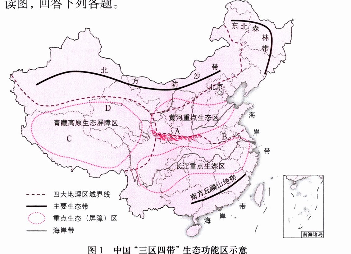 (1)黄河重点生态区和长江重点生态区的分界线是A______(填山脉)、B______(填河流)。