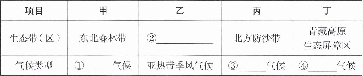(3)①温带季风 ②长江重点生态区(或南方丘陵山地带) ③温带大陆性 ④高原山地