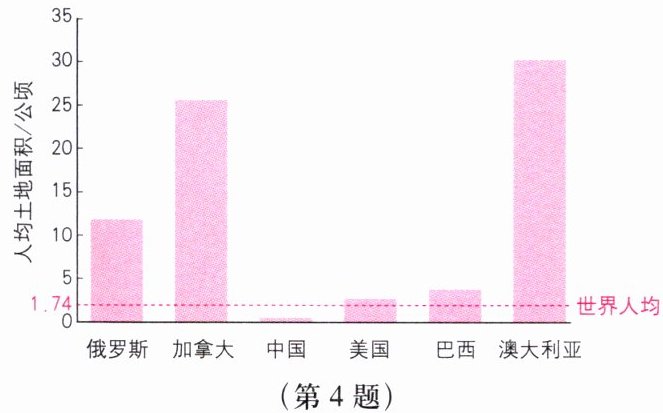 4. 读“世界面积前六的国家人均土地面积(2020年)”图可知,我国土地资源的特征是( )