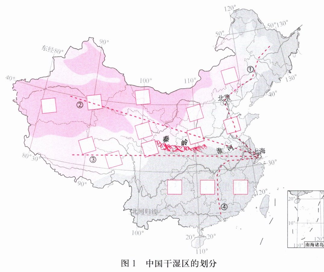 (1) 在图中填注湿润区、半湿润区、干旱区、半干旱区。
