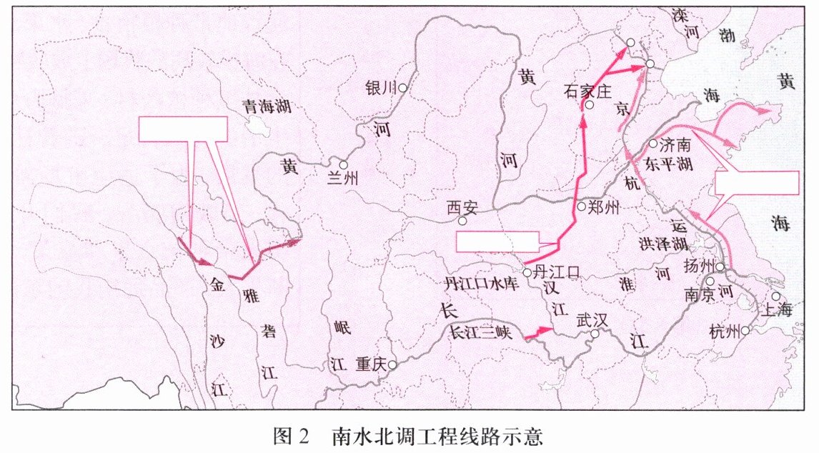 (2) 南水北调工程是我国跨______、跨______调水的骨干工程,把______流域丰富的水资源调到______、______(填地理区域)地区。
