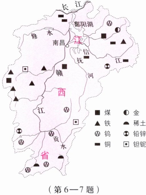 读“江西省主要矿产分布”图,回答第6—7题。