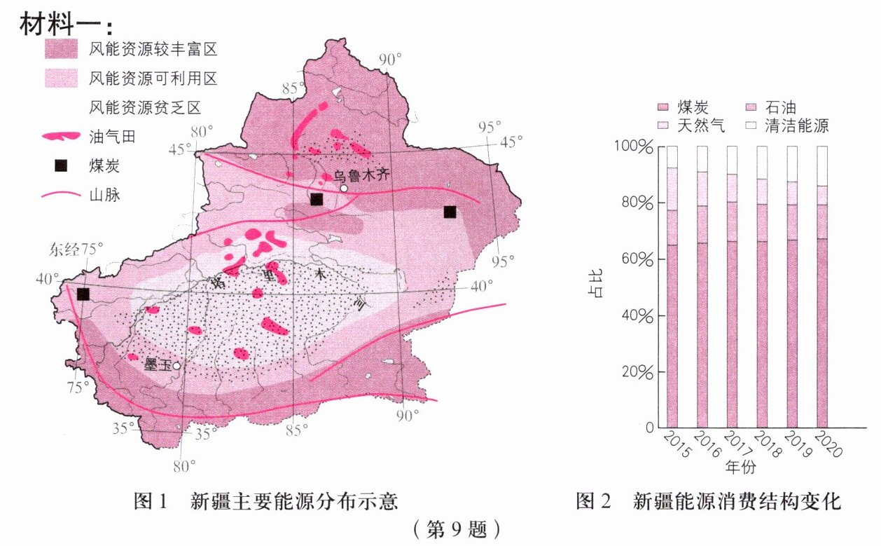 材料二:近年来,以风电为代表的新能源发电,在新疆能源消费结构中的占比稳步提升,在“疆电外送”中占比超三成,不仅成为带动新疆经济高质量发展的新增长极,也为全国实现“双碳”目标贡献了新疆力量。