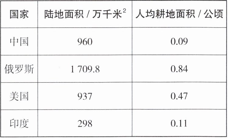 |国家|陆地面积 / 万千米$^2$|人均耕地面积 / 公顷|