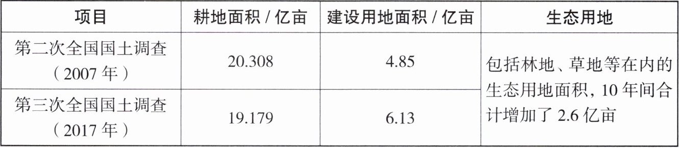 |第二次全国国土调查(2007 年)|20.308|4.85|包括林地、草地等在内的生态用地面积,10 年间合计增加了 2.6 亿亩|