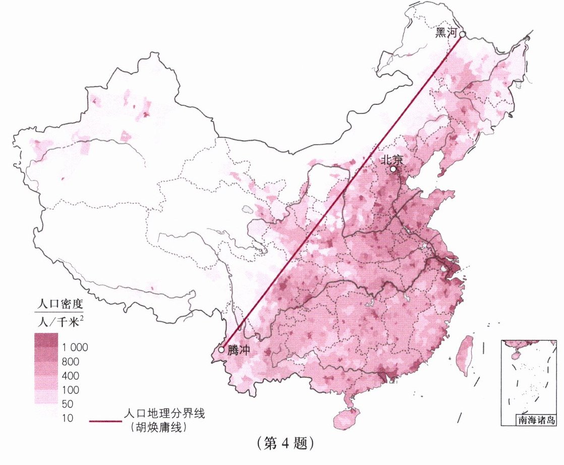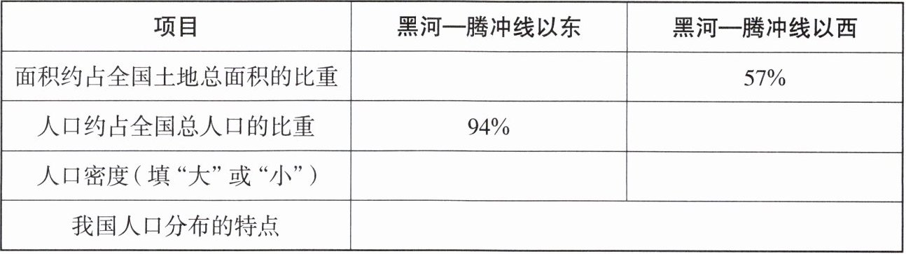4. 读“中国人口的分布”图,将表 2 中相应的内容填写完整。