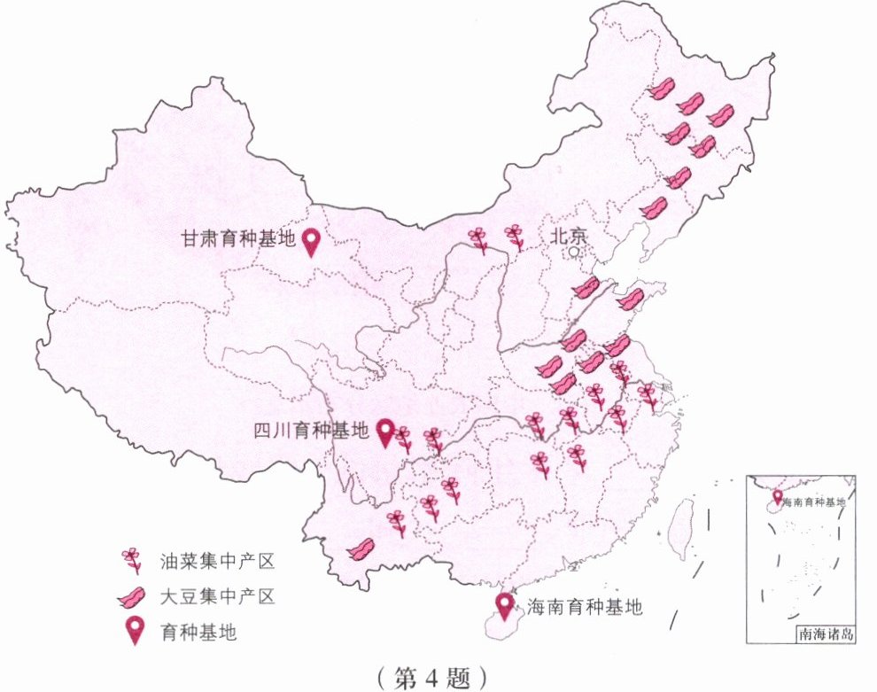 4. 读“中国三大国家级育种基地及部分农作物的分布”图,回答下列各题。